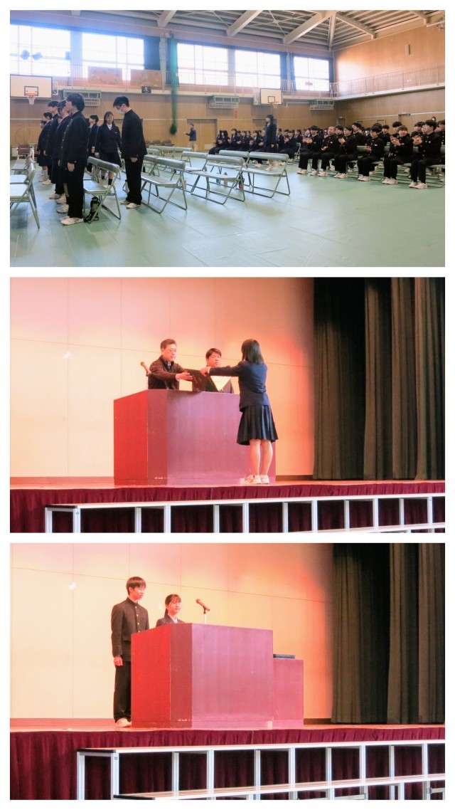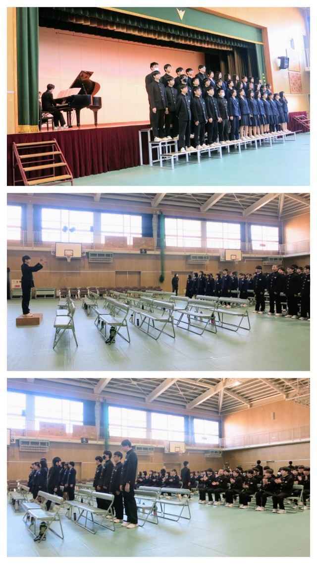 2時間目と3時間目に全校生徒で卒業式の予行を行いました。