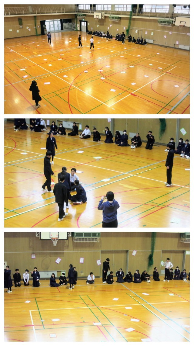 1年生は5時間目に体育館を使い、学年レクの「ジャンボ百人一首大会」を行いました。