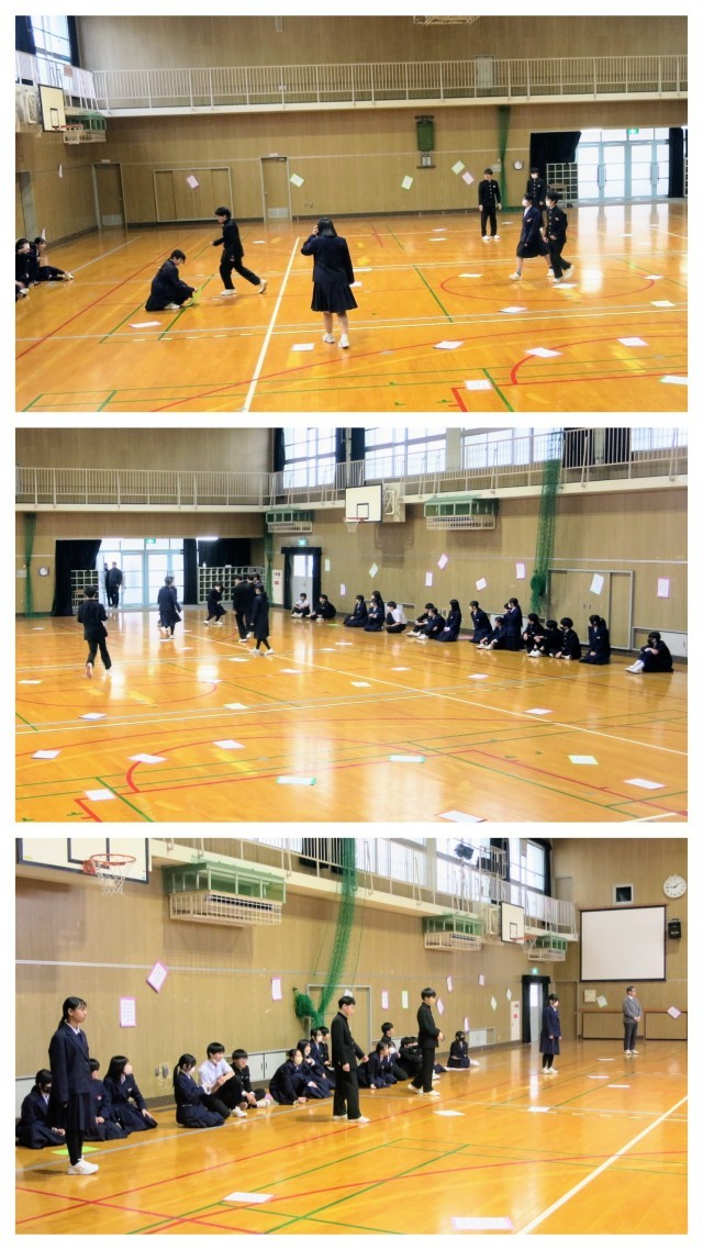 まさにジャンボな取り札100枚を体育館のフロア全面に散りばめるだけではなく、周囲の壁にも貼り付け、班対抗戦です。班から順に1名ずつ選手が出てきて、CDからの「読み」を聞いて、取り札にダッシュです。班の仲間から「あっちぃ―!」、「前の壁っー!」、「もっと左っー!!」など、札のある場所を教え合う場面もありました。