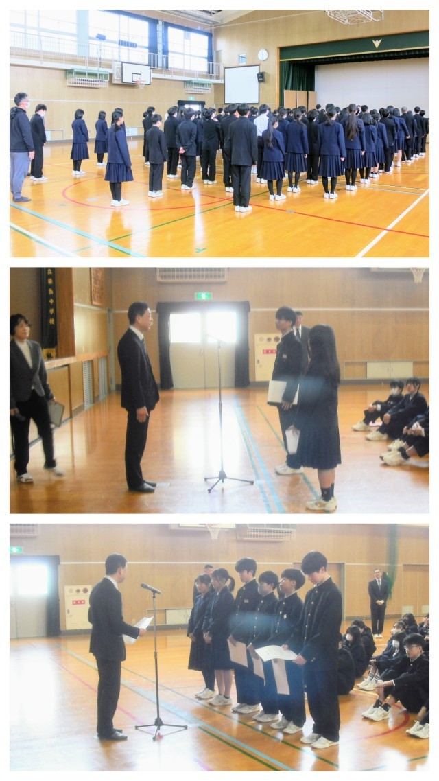 まずは、1年生と2年生の代表生徒に「修了証」をお渡ししました。(他の生徒のみなさんには、この式後の学級活動にて担任の先生から、通知表とともに渡されます)