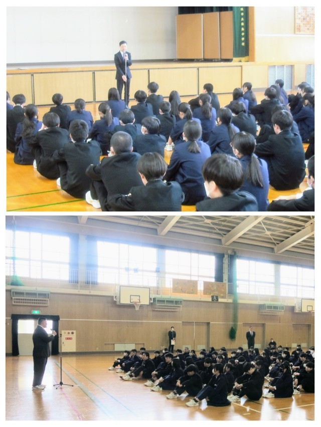 最後に、生徒指導担当の先生から、春休みの生活面についての注意点、道路交通法の改定、特に自転車での注意について、4月からの2年生、3年生への進級を控えての心の準備、生活の準備をきちんと行うこと、とお話しがありました。