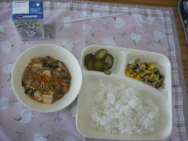 今日は、2年1組の給食の様子です。 マーボー豆腐は、しょうが、にんにく、トウバンジャンを香り良く炒め、ひき肉、たまねぎ、にんじんを加え、湯を加えて煮る。豆腐を加えてさらに煮て、最後に水溶きでん粉を加えてとろみをつけました。ごはんによく合い、食が進みました。