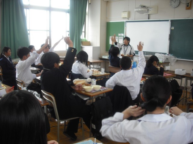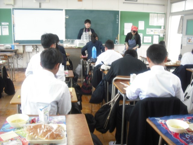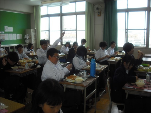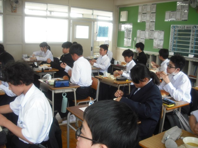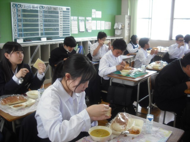 煮込みハンバーグは、炒めたたまねぎに湯、ケチャップ、ウスターソースを加えて煮汁をつくり、ハンバーグ、マッシュルームを加えて煮込んだものです。味がしみ込み、柔らかくて、とても美味しかったです。コーンスープは、コーンの甘みがよくでておいしくいただきました。おさつチップやスライスチーズもあり、おかわりを希望する生徒がたくさん手を挙げていました。