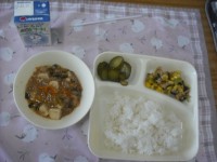 今日の献立 ・マーボー豆腐 ・きゅうりの中華あえ ・ツナとチンゲンサイのいためも...