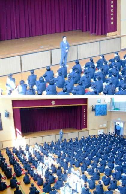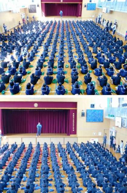 写真で見ておわかりのように、瑞光中学校を素晴らしい学校にしようとする羽原生徒指導主事の熱い思いが全校生徒に伝わり、全校生徒が縦横まっすぐにきちんと並べるようになりました。