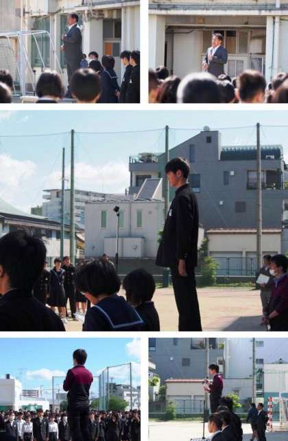 全校生徒とのあいさつの後、阪井校長先生からは平成が終わり令和が始まったことの振り返りや天皇の退位や即位での三種の神器、国璽御璽のお話がありました。また、連休中はできる範囲でいろいろな部活動の応援に行き、真剣に頑張っていた瑞光中学校の生徒たちに元気をもらい、嬉しく思うとお話されました。