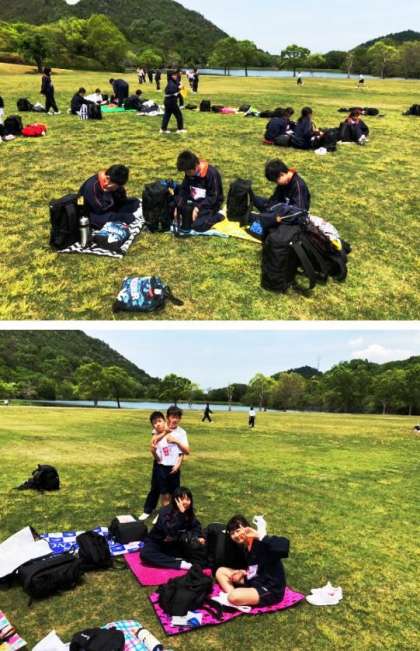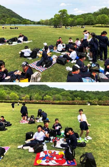 すごく広い芝生広場で、クラスごとに分かれて昼食中です♪