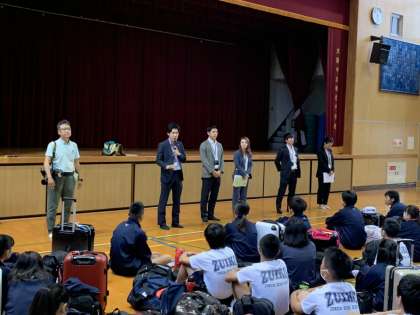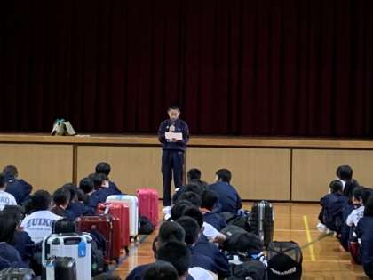 出発式では、阪井校長先生のあいさつ、代表生徒あいさつ、添乗員・写真屋さんの紹介があり、最後に記虎学年主任より諸注意がありました。