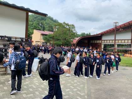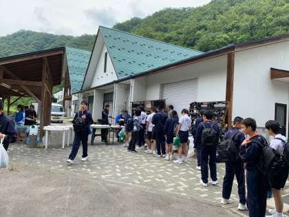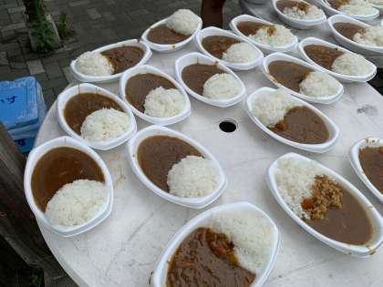 昼食のカレーライスを受け取り、河原でそれぞれ昼食です。