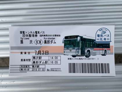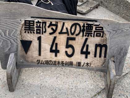 関電トンネル電気バスの乗車券と黒部湖の看板と黒部ダムの標高1454mの表示です。