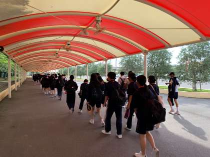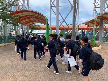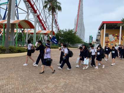 楽しいかったナガシマスパーランドの活動が終了し、メインゲート前に集合してからバス駐車場に向かっています。