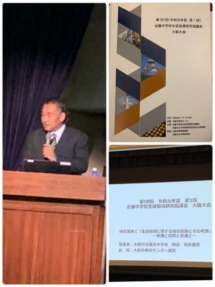 午後からは大阪市からの研究発表を本校の羽原教諭が担当し、「生活指導に関する現状把握とその考察」〜知識と知恵と見識と〜を発表しています。午後1時20分から行われています。午後2時20分までの1時間を予定しています。