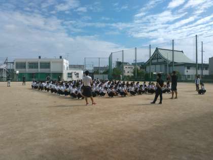 本日は体育館での定例の3年学年集会ですが、2年生の臨時の学年集会のために急遽、運動場に場所を変更して行いました。