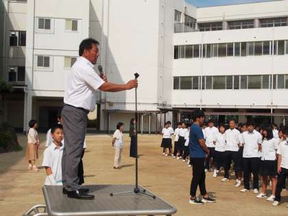 本日7月16日(火)は快晴の元、全校集会を行いました。3連休の後、夏休み前ということで集合が少しダラダラしましたが、全校生徒と阪井校長先生とのあいさつの後、ラグビー部の2年生大会Dブロック優勝の表彰がありました♪