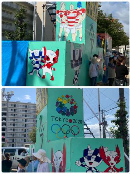 聖火台には毎年、話題の絵が描かれていますが、今年はキン肉マンのラグビー日本代表と来年の東京オリンピックのマスコットキャラクターが描かれています。