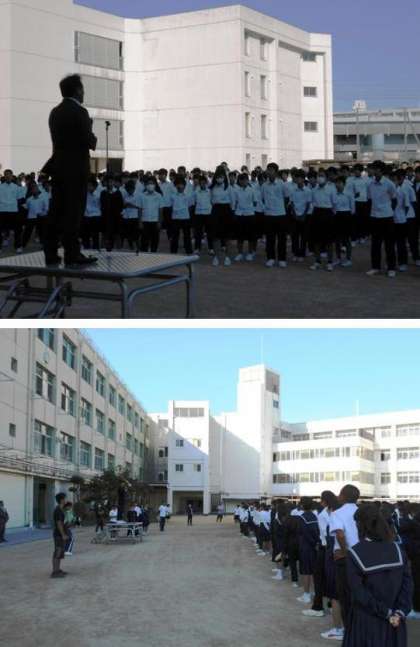 本日10月7日(月)早朝は少し肌寒い気温でしたが、快晴の元、全校集会を行いました。全校生徒と阪井校長先生との挨拶の後、阪井校長先生から今日もラグビーワールドカップのことについてのお話がありました。