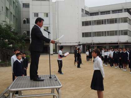 今日の全校集会は女子ラグビー部の表彰がありました。