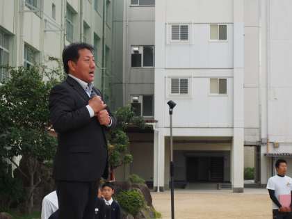 校長先生からのお話で、先週の文化発表会では、それぞれの学年や団体が1つになって一生懸命に取り組んでいる姿が、ワールドカップラグビーの日本代表の姿と重なって、とても素晴らしく、誇れるものだとほめていただきました。