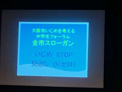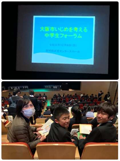 本日12月8日(日)は、阿倍野区民センターにて大阪市いじめを考える中学生フォーラムが開催されました。大阪市立中学校130校すべての生徒会2名と生徒会担当教員、各校校長先生が出席し、各ブロック代表校の発表と大阪市いじめを許さないスローガンの策定が行われました。