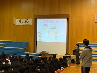 1年生の5・6時間目は格技室で3クラスごとにネット上のマナーやSNSの怖さなどを学びました。
