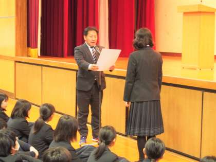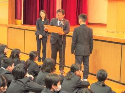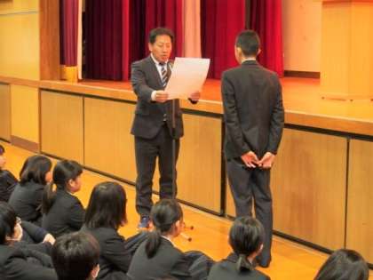 今日の始業式はまず、野球部のWBC(Winter Baseball Cup)4位と、大阪府アンサンブルコンテスト管楽六重奏銅賞と大阪府青少年環境問題協議会会長賞の3つの表彰が行われました。