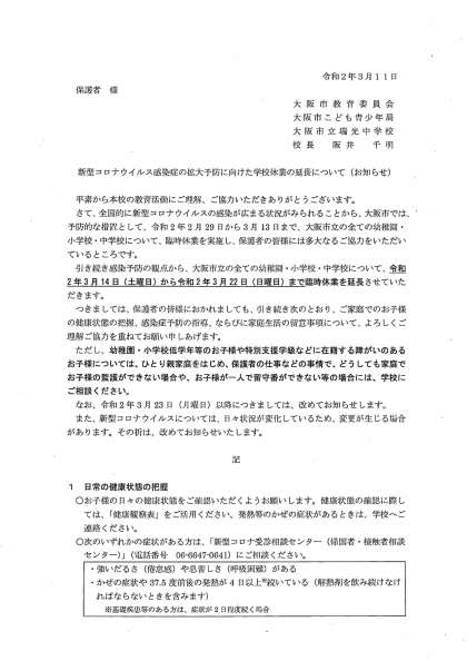 先程、大阪市教育委員会及び大阪市こども青少年局より、新型コロナウイルス感染症予防に係る臨時休業の延長についての通達がありました。