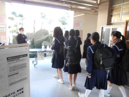 3年生は今日は健康観察のため登校日となっています。感染拡大防止対策のため学年教職員が玄関でマスクの着用と手の消毒を行い配慮しています。