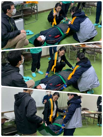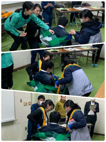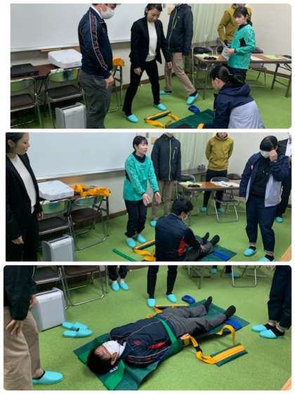 生徒介助のための救助担架フレスト(フレキシブル・ストレッチャー)の使用方法を全員で確認しました。