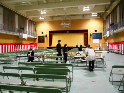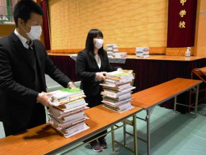 午前中、10時から11時30分に行われた新1年生の保護者の方々への教科書等の配付は、混雑することなく順調に行われました。午前中の段階で残り29名となっています。