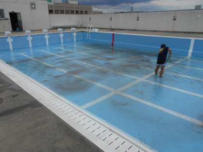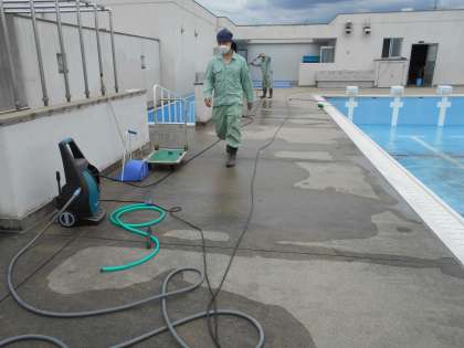管理作業員さんや体育科の先生がプールを掃除してくれています。いつもよりプール掃除が遅いのでとても汚れがひどくなっていました。今月はプールの授業ができませんが7月から実施できるように準備しています。15日からは部活動も再開していきますので、生徒たちが元気に泳げる日が待ち遠しいです。