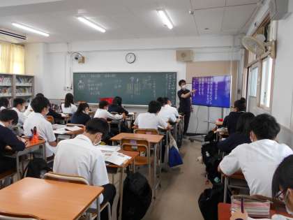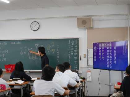 こちらも3年生国語科の吉川先生の授業です。こちらも大型テレビを活用し授業の解説を行っていました。ICT機器をうまく活用し効果的な授業の工夫をしています。学力向上に取り組んでいます。吉川先生は、オンライン授業動画の作成もできる先生ですので、これからも楽しみです。