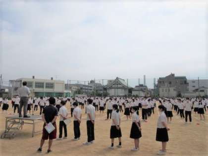 今日は1学期最初の全校集会が行われました。感染症予防のためいつもよりも間隔をあけての全校集会でいつもと向きも違い、グランド全体を使っての形で、2・3年生は戸惑ったかもしれませんが非常にスムーズに並んでくれていました。