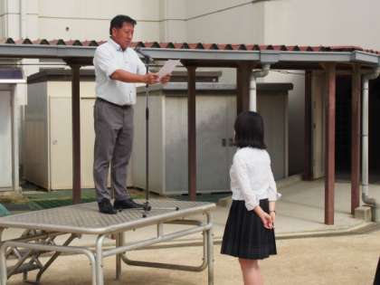 全校集会の最後に前期の学級役員の認証式が行われました。代表で各学年1組女子の学級代表が校長先生から認証状が手渡されました。他に風紀委員・文化委員・美化委員・体育委員・保健委員があります。今日は放課後に各学級役員の会議もあります。頑張ってください。