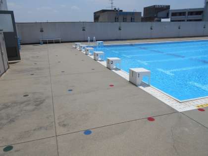 プールサイドでの間隔をあける目安のポイントがわかりやすいように、カラーで目印をつけています。梅雨が明けると本格的な暑さがやってきます。しっかり感染予防を行い、水泳の授業も実施いたします。