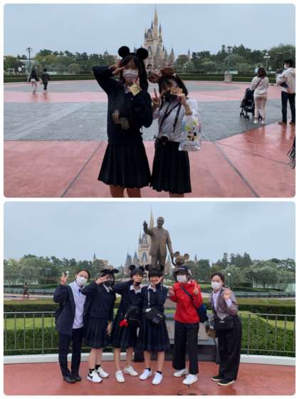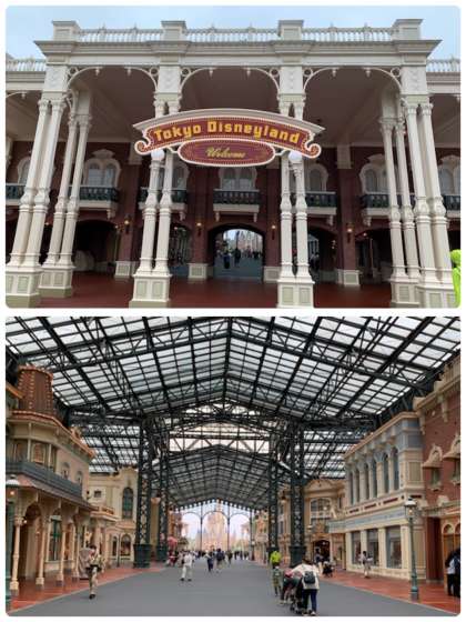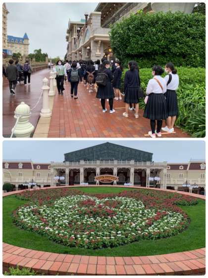 東京ディズニーランドに入場しました。小雨がパラついていますが、傘をさしていない人がほとんどです。