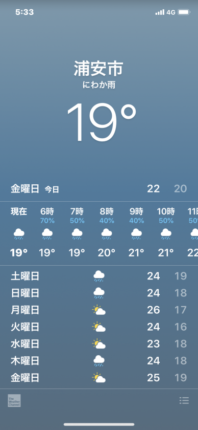 おはようございます。本日の浦安市は「にわか雨」の天気予報通り、小雨がパラつく天気です。