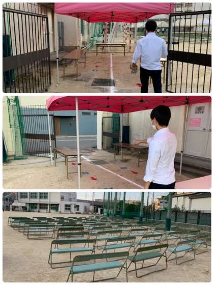 保護者用の東門から保護者は入校しますが、受付表と入校許可証があれば、手指消毒のみで入校出来ます。忘れた場合は、検温、受付表記入、入校台帳記入が必要です。マスクは必ず、常時着用でお願いします。