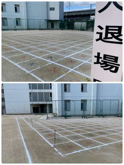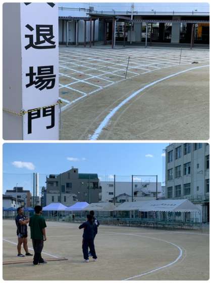午後からの体育大会に向けて、3年、2年、1年の生徒席のラインを綺麗に引き直し、本部や保護者席のテント設置も完了しました。