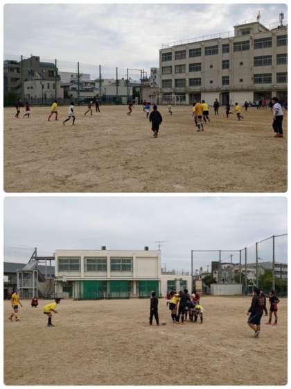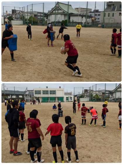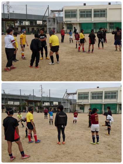 本日10月18日(日)は、本校グランドにてソーシャルディスタンスをしっかりと守って、東淀川ラグビースクールの5、6年生と合同練習をしました。