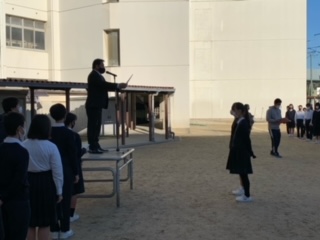 全校集会では、まずソフトテニス部の表彰が行われました。ブロック大会で3位入賞です。よく頑張りましたね。おめでとうございます!
