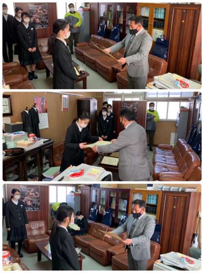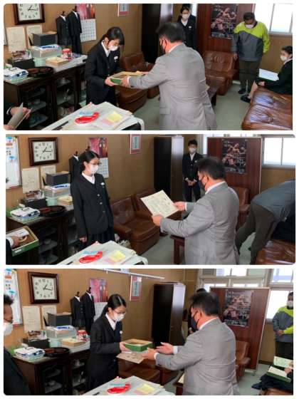 全国納税貯蓄組合連合会より、「税の作文」で入選した作文の表彰状及び副賞が届けられたため、校長室にて表彰式を行いました。