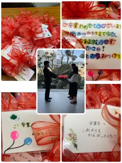最後に在校生から卒業生へメッセージカードの贈呈式が行われました。1・2年生の想いのこもったメッセージカードが191枚贈呈されました。3年生はこのリボン付きメッセージカードを胸につけ、卒業式に臨みます。