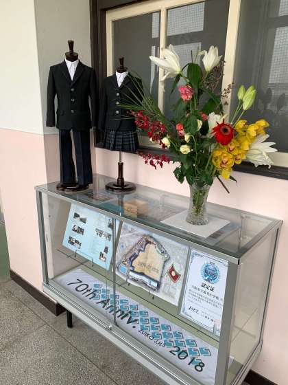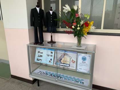 また、校長室前には、本校標準服のミニチュアが飾られており、その下のショーウインドには2年前の本校70周年記念グッズが飾られています。