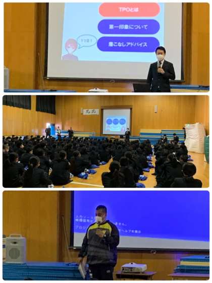 1年生は、1限目の集会指導の後、2限目に格技室にて集会と着こなしセミナーを実施しました。