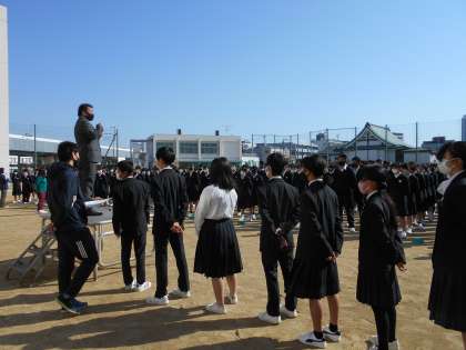 全校集会をおこないました。今日は少し寒い朝でしたが、生徒のみなさんは昨日よりも早く整列もできていました。