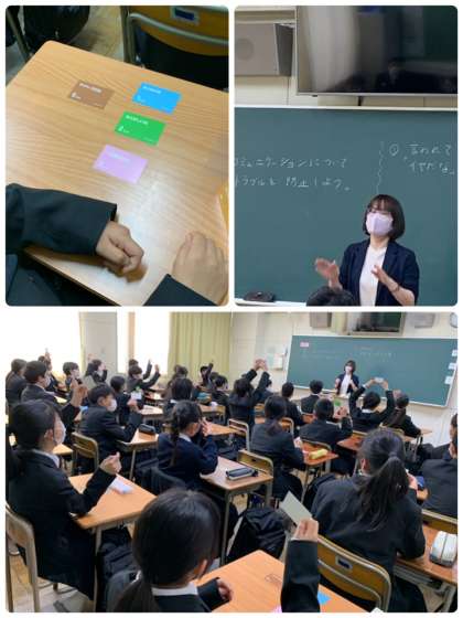 1年生は学級写真撮影後の2限目に、LINE等SNSでの何気ない言葉のトラブルについての学習を行いました。