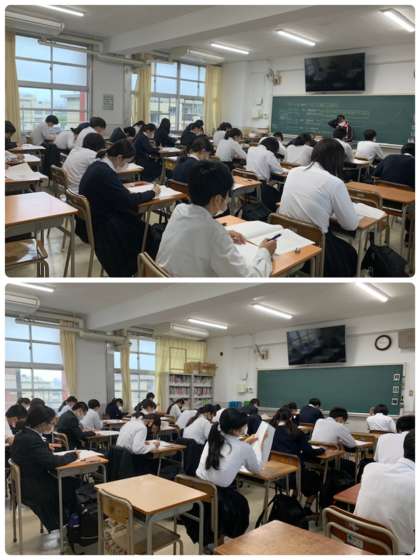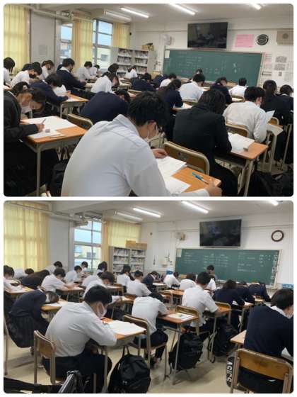 写真は上から順に、3年1組〜3年6組の1限目の国語テストの様子です。
