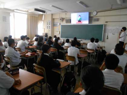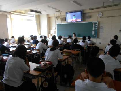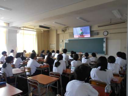 本来は、体育館で全生徒が集まって実施していますが、感染症対策のために各教室へオンラインで配信しての演説会となりました。