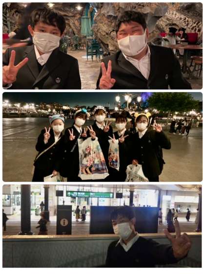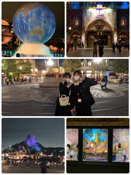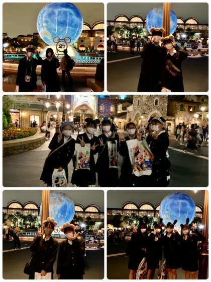 女子が退園する前に、出口前の地球儀で記念撮影です。