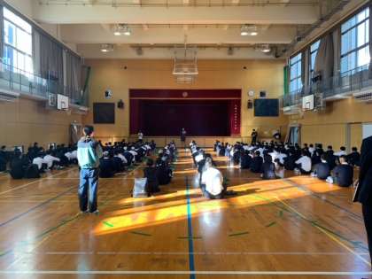 2年生学年集会を体育館で行いました。記虎学年主任からお話で、松坂選手の引退会見での「がんばることの大切さ」についてお話していただきました。